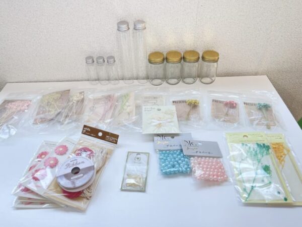 はじめに瓶を選んでもらい、その後はそれぞれ好きな花やビーズなどを詰めていきました♪