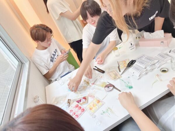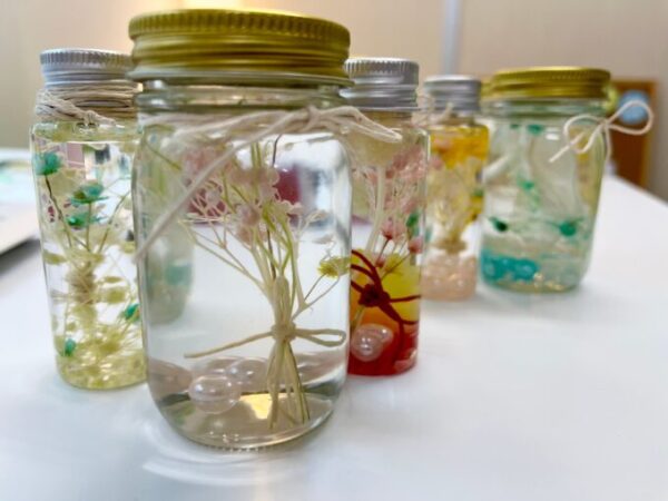 最初は何を入れるか、どんな色合いにするか迷っている生徒さんもいましたが「きれいだね✨」などみんなで声を掛け合っているうちに素敵なハーバリウムが完成しました!!