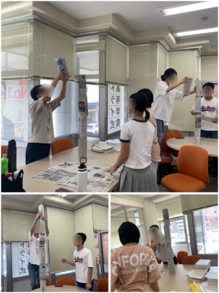 テープ等は使わず、6枚の新聞紙のみを使ってどのくらい高く積み上げられるかに挑戦します。せっかくなので、2つのチームに分かれて競うことにしました!この日の参加者は5名だったので、スタッフもAチームに入ってお手伝い🎵