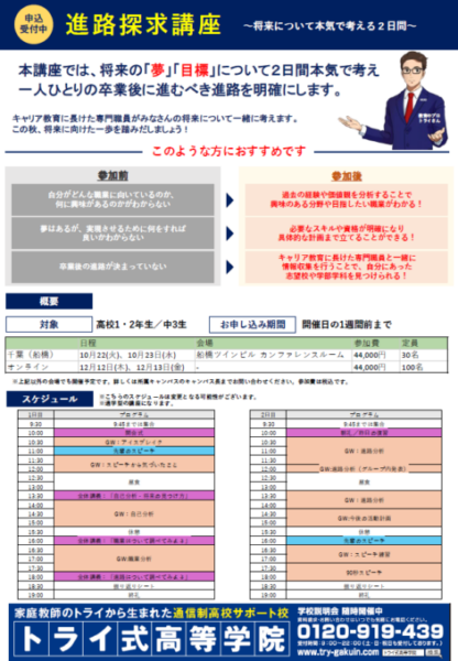 トライ式高等学院では、定期的に「進路ガイダンス」「進路探求講座」などを開催し、進路について考える機会を設けています。