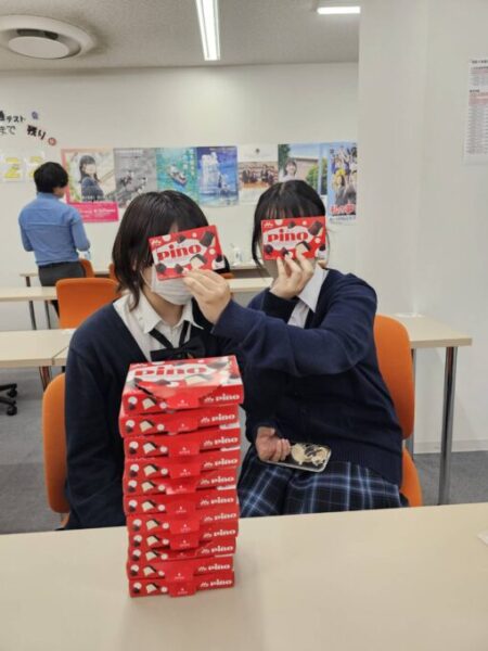 二人の生徒の前に積み上げられたピノの山、