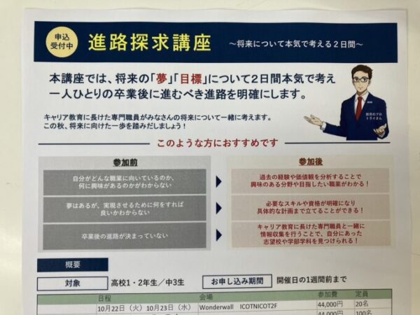 1,2年生はどちらか参加をしてね!特に進路が決まっていない人は進路探求講座参加必須です🌟遠慮なく相談しに来てね(^▽^)/