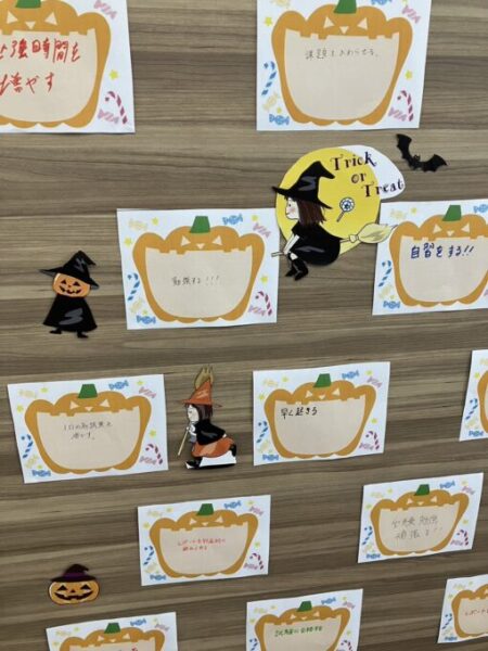 今月のテーマはハロウィン🎃✨✨ということで、毎月立てている月目標の掲示も合わせて、かわいい魔女やお化けたちが一緒に入口でお出迎え👻