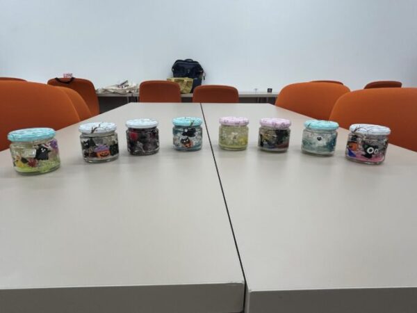 瓶の中にハロウィンのお化けや花を飾りながら細かく刻んだ蝋を入れ