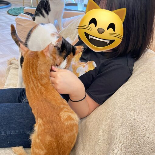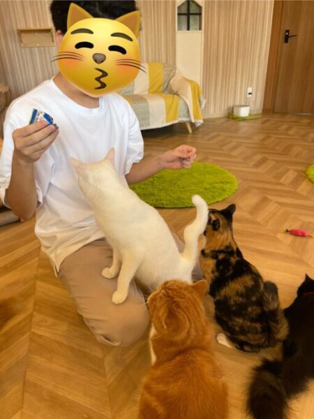 かわいい猫ちゃんに囲まれて楽しんでいるようすを