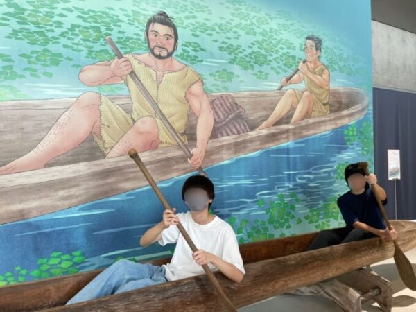 仲良しMくんとHくんは、発掘された木船のレプリカに乗り込んでハイポーズ📸
