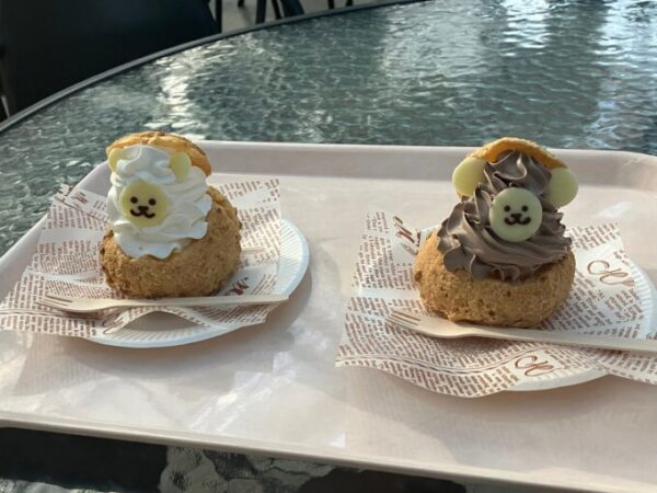 USJのマリオカフェで食べられるマリオとルイージをイメージしたショートケーキとレアチーズケーキを食べました。外側のパンケーキがマリオとルイージのカラーで、かわいくて食べるのがもったいなかったです!神戸でも神戸動物王国のアルパカシュークリームがとてもかわいくて食べるのが惜しかったです!
