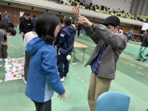 👇反射神経ゲームの様子(ボールを落としているのが布施の生徒です)
