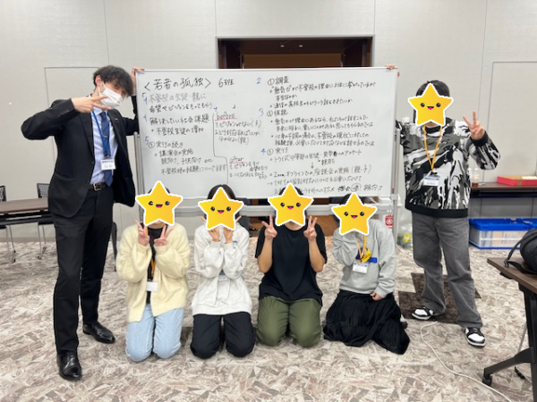 「1日かけて行ったチームプレゼンは、推薦入試の際に実績として書けるのでとても良い機会となりました!50個の社会問題の中からグループごとにテーマを選んでまとめる流れで進みました。私たちのグループは若者の孤独について選び、中学生の不登校を解決するには?といった内容をまとめて発表しました!」