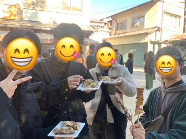 さて!お宮参りと紅葉を堪能した後は、みんなが楽しみにしていた牡蠣🦪🦪広島キャンパスの生徒さんは、広島出身ということもあり?牡蠣めっちゃ好き!と言ってとてもおいしそうに食べていました😋焼き牡蠣だけでもバター醤油、ポン酢、チーズ入りなど様々でした!みんな熱々の牡蠣を冷ましながらおいしそうに頬張っていました😋😋下記を食べた後は、甘いものが欲しい!と今度は揚げ紅葉!今度はしょっぱいものが食べたいともう一度牡蠣を食べている生徒さんもいました🦪🦪本当に美味しかったんですね😊