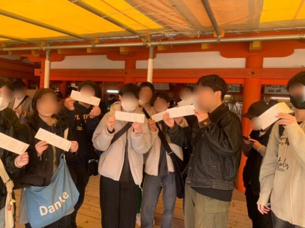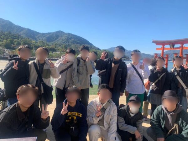 今年は、もみじの見頃が例年に比べて遅かったようで丁度もみじが赤く染まっている時期に遠足に行くことが出来ました!14人の生徒さんが宮島の紅葉狩り遠足イベントに参加してくれました✨✨全員でGOOD TIMING👍当日の天候は晴天で良い気候の中で遠足をすることが出来ました!お昼前に広島キャンパスを出発🏫電車で宮島口まで行きフェリーに乗って宮島港まで行きました🚢船は風通しが良く寒いくらいでしたね🥶