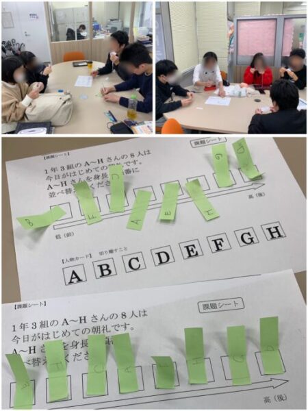 個々に配られたカードの情報をもとに身長順に並べていきます。どちらのチームも手際よく情報を整理していき、短時間で正解に辿り着きました👏👏