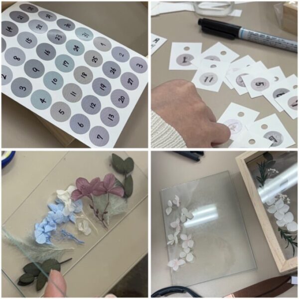 数字が書き終わったら、次はガラスにドライフラワーを挟みます🌺🌼🌹ドライフラワーも何種類か用意したので、みんなそれぞれ好きなものを選んで、バランスを見ながら配置します😉