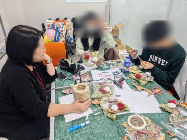 和柄の折り紙で扇を折ったり、扇型の厚紙に布を張ったり『賀正』や『謹賀新年』の紙を切り取ったりして、しめ縄の飾りを作ります♪