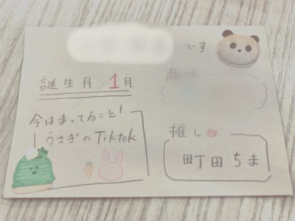 今回の最大の目的は、同級生について知ろう!!っと言うことなので、新入生には自己紹介カードを作成してもらいました♬大人もそうですが、その場で名前を聞いても後から・・あれ?名前を思い出せないなんて事はありませんか?その後、聞きにくく話がしずらかったり・・そこで、自己紹介カードを利用し相手に名前を覚えてもらおうと作成しました。カードは、シールやペンを使用し自由な発想で作成してもらいました。一人ひとりの個性が出ていて面白かったです♫