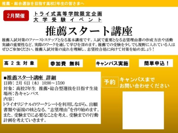2月6日(木)10:00~15:00の日程で『推薦スタート講座』が開かれます!