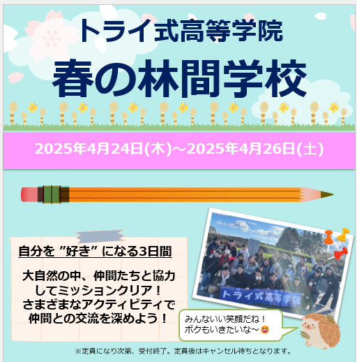 トライ式高等学院では 今 「春の林間学校」 のご案内中です!