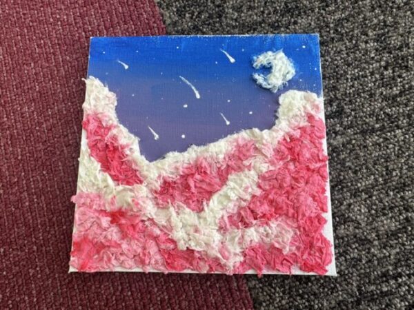 キッチンペーパーを小さくちぎって、水に浸した後は、絵の具で着色して、ピンセットでキャンパスに丁寧に貼っていきました✨下書きを丁寧にしてから貼る子もいれば、下書きなしで感覚に任せて貼っていく子もいました🎵根気のいる作業が続きましたがみんな真剣に取り組んでくれました🥰