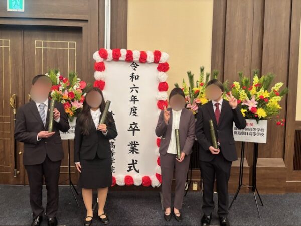 当日は小雨が降る中、参加してくれるか心配していましたが、東岡崎キャンパスからも4名の生徒が卒業式に参加しました😄