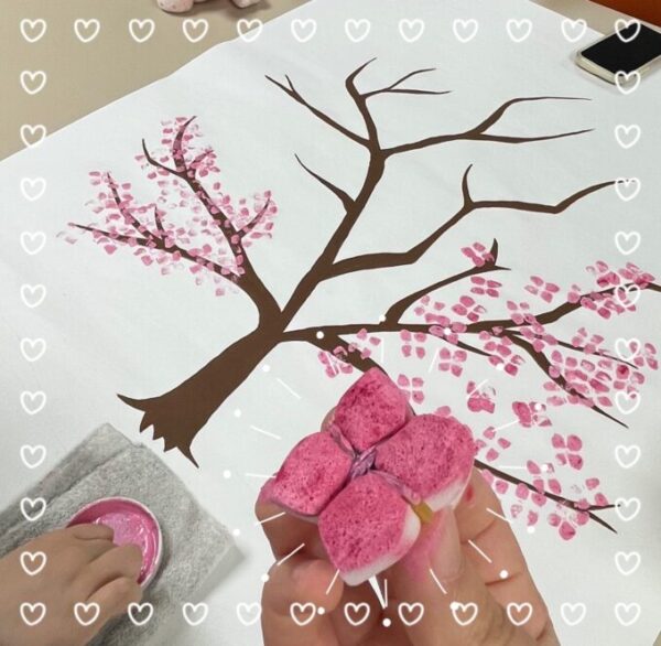 みんなでスタンプをポンポン押していくごとにみるみる桜らしくなっていきます🌳🌸✨