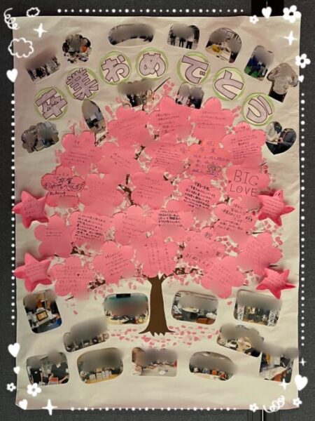 桜の木は卒業する3年生に向けて在校生や先生方からのメッセージカードや思い出の写真を貼り、1枚の模造紙にまとめたものです📄✨✨