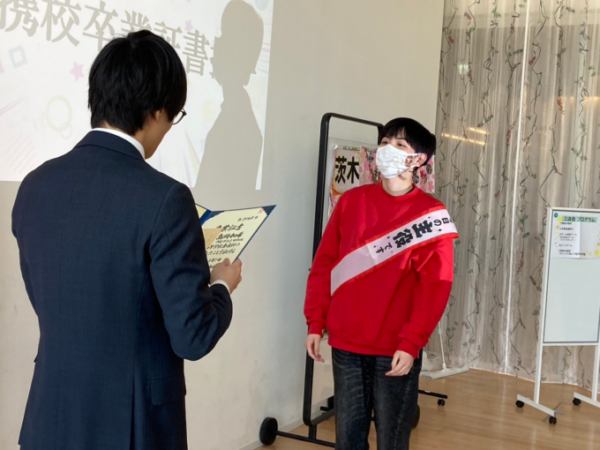 まずは連携校卒業証書授与です!先日行われた卒業式で、トライの修了証書は渡しましたが、今日はそれぞれが所属している連携校の卒業証書を授与しました!