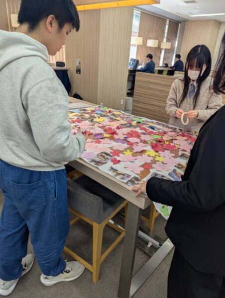 在校生や講師、スタッフが心をこめて書いた桜の花のカードを一枚一枚貼っていっています😊