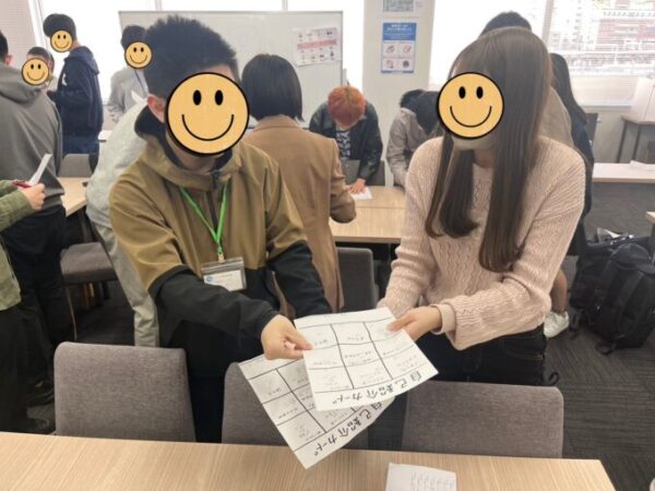 9個のマスに書いてある質問の答えが自分と同じ人を探しビンゴを完成させるというゲームです📝