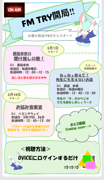トライの高校生がDJを務め、OVICE内で繰り広げられるラジオ番組のようなコンテンツです!