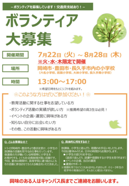 トライ式高等学院では、毎年7〜8月の夏休み期間に学童支援ボランティアを開催しています☀