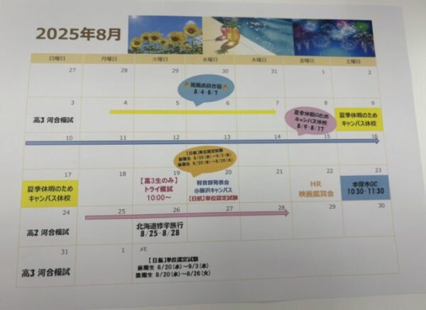 8月は修学旅行、単位認定試験、模試、イベント等盛りだくさんです!