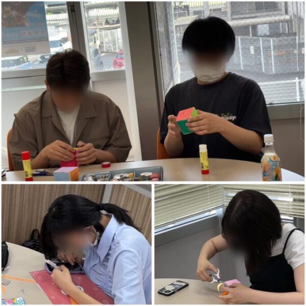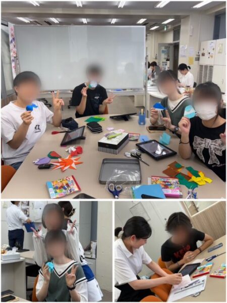通常は13:00〜15:00がアートサークルの時間ですが、夏休みの間、サークル活動は午前中に行うため、10時からスタート。が、しかし…参加者は1人…💦1年生のHちゃんと二人、今日は完成できないかな?と話していましたが、「手伝いますよ~!」と徐々に参加してくれる生徒さんが増えてきて、一安心😊みんなで夏をイメージできるモチーフを折り紙でせっせと折りました🐬🌞🍦