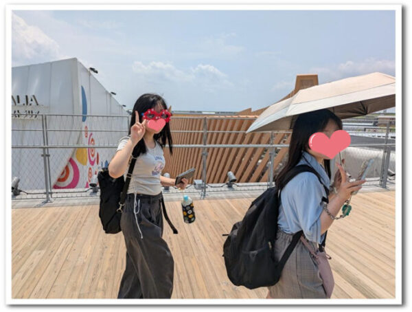 日差しが照り付ける中、関西万博の象徴、ギネスに最大の木造建築物として認定された「大屋根リング」も歩きます。