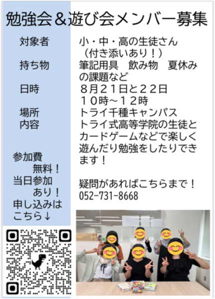 トライ式高等学院の生徒が企画・準備・実践を行います!生徒が勉強や生活の相談にものります!楽しい遊びもします!