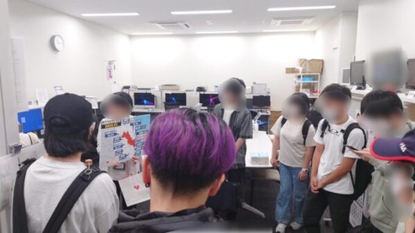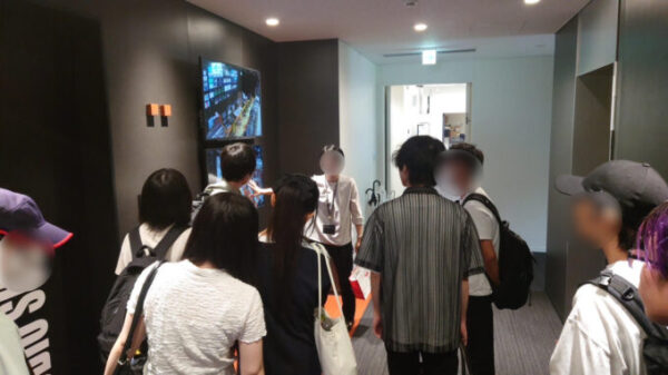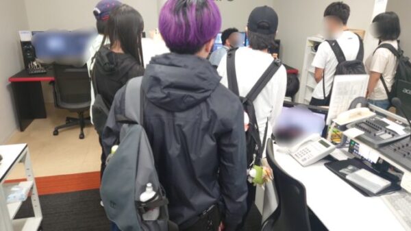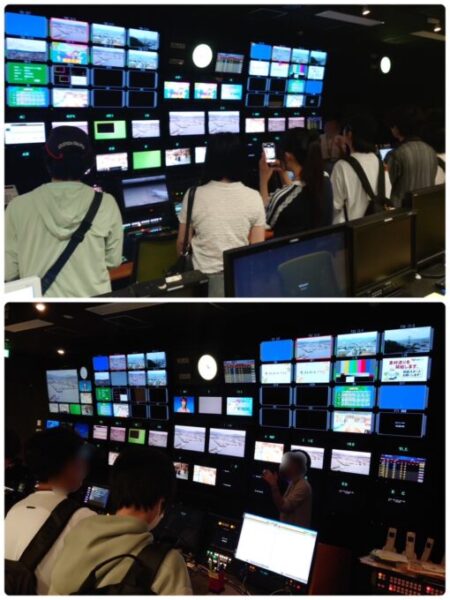 副調整室の沢山の画面と放送機材に興味津々の生徒