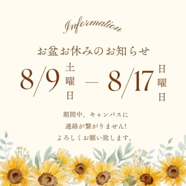 上記期間はお盆休みのため、キャンパスに連絡が繋がりません❗❗❗