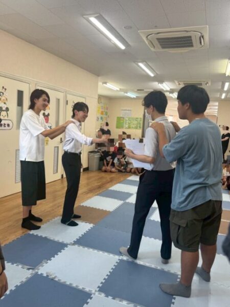 今回の学童ボランティアでは、じゃんけん列車、ジェスチャーゲーム、ボール回し、新聞紙バトルの4つのゲームを行いました。