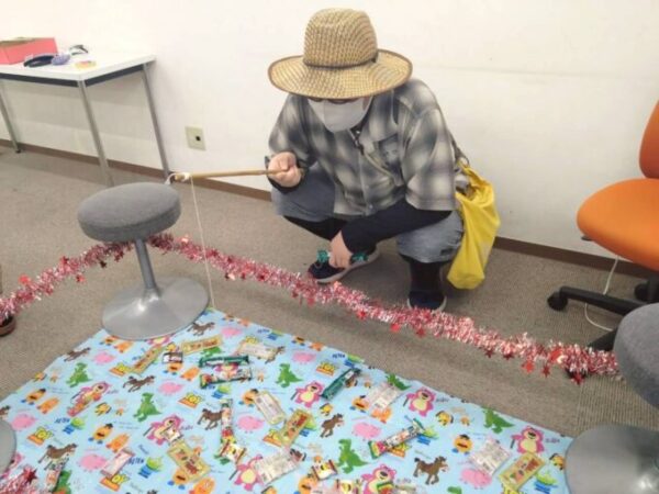 お菓子釣りは、釣り堀に見立てたものにお菓子を並べて、制限時間1分間でお菓子を釣るゲームです🐡