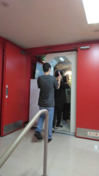 エアシャワーに入り、全身に高圧の空気を吹き付けて、体や衣服に付着した最後のホコリや異物を除去する体験をしました。