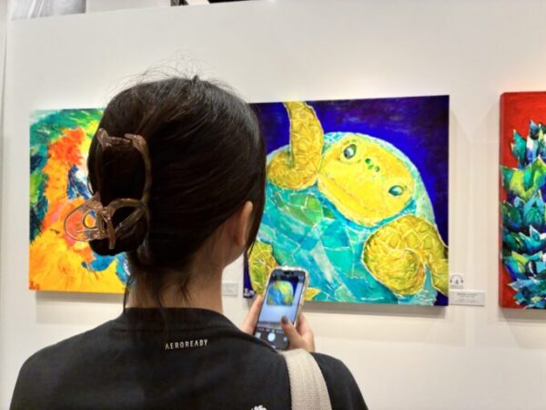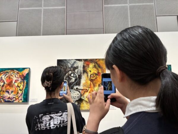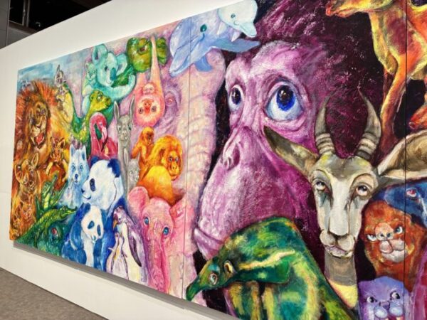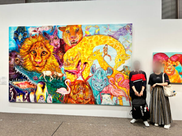 独特な色使いとキャンバスいっぱいに描かれた力強い動物たち🦁🐴🐘石村さんの作品中の動物は目がとても特徴的でみんな優しい目👀♡ 目は最後の仕上げでその動物の気持ちを考えて決めてから描かかれているんだとか🤔