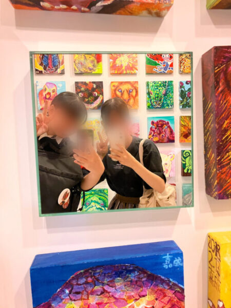 壁も天井もキャンバスだらけの部屋で鏡の中の自分たちとパシャリ☺️📸