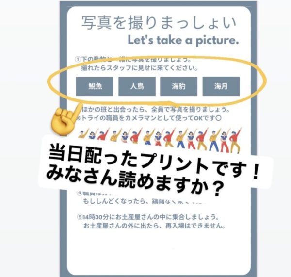 今回は3~4人の班に分かれて、ミッションに挑戦してきてもらいました!