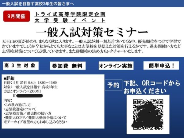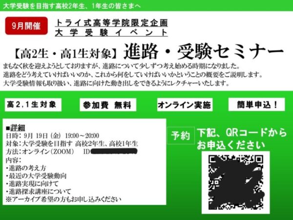 9月、トライ式高等学院では、オンラインによる進路・受験セミナーを開催しました✨