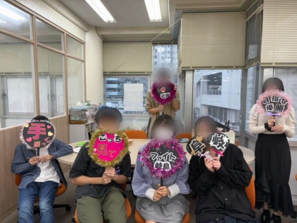 岐阜キャンパスのチームカラーは『ホットピンク💓』なので、応援旗やうちわは思い切りピンク仕様です💓