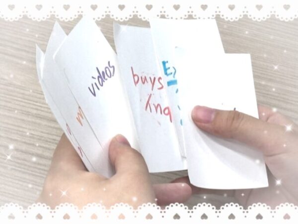 ①カード1枚に英単語を1つずつ書いていきます。