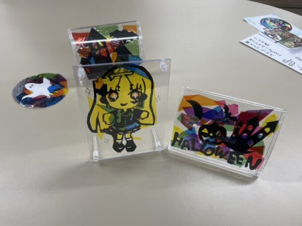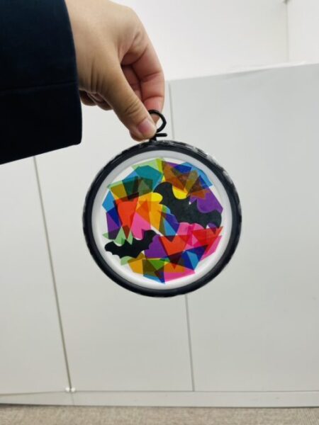 裏からカラフルな色紙やセロハンを貼って色を付けていきます。