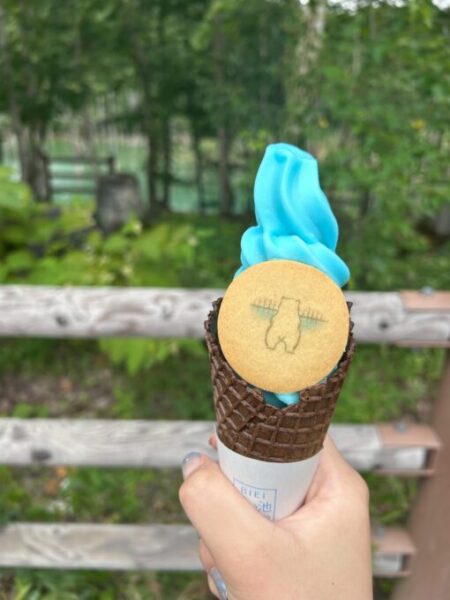 「見た目も味もインパクト抜群な青いソフトクリームとくまさんクッキー」