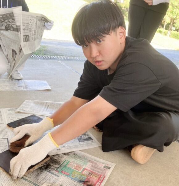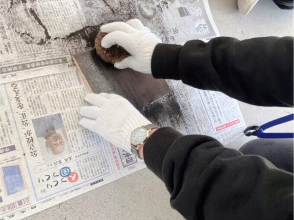 ゴシゴシッと板の炭をたわしでけずっていきます😆😆