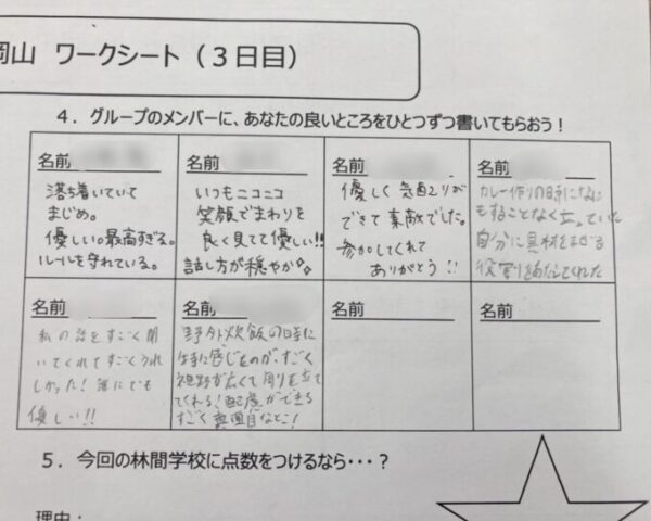同じ班で3日間過ごした仲間の「良いところ」をみんなで書き合いっこします!!