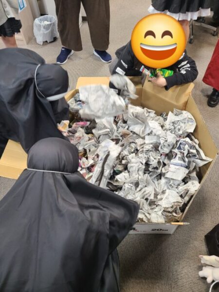 お菓子探しは、新聞紙をくるんだものを沢山敷き詰めて、その下に隠れているお菓子を30秒間で取るというゲームでした。
